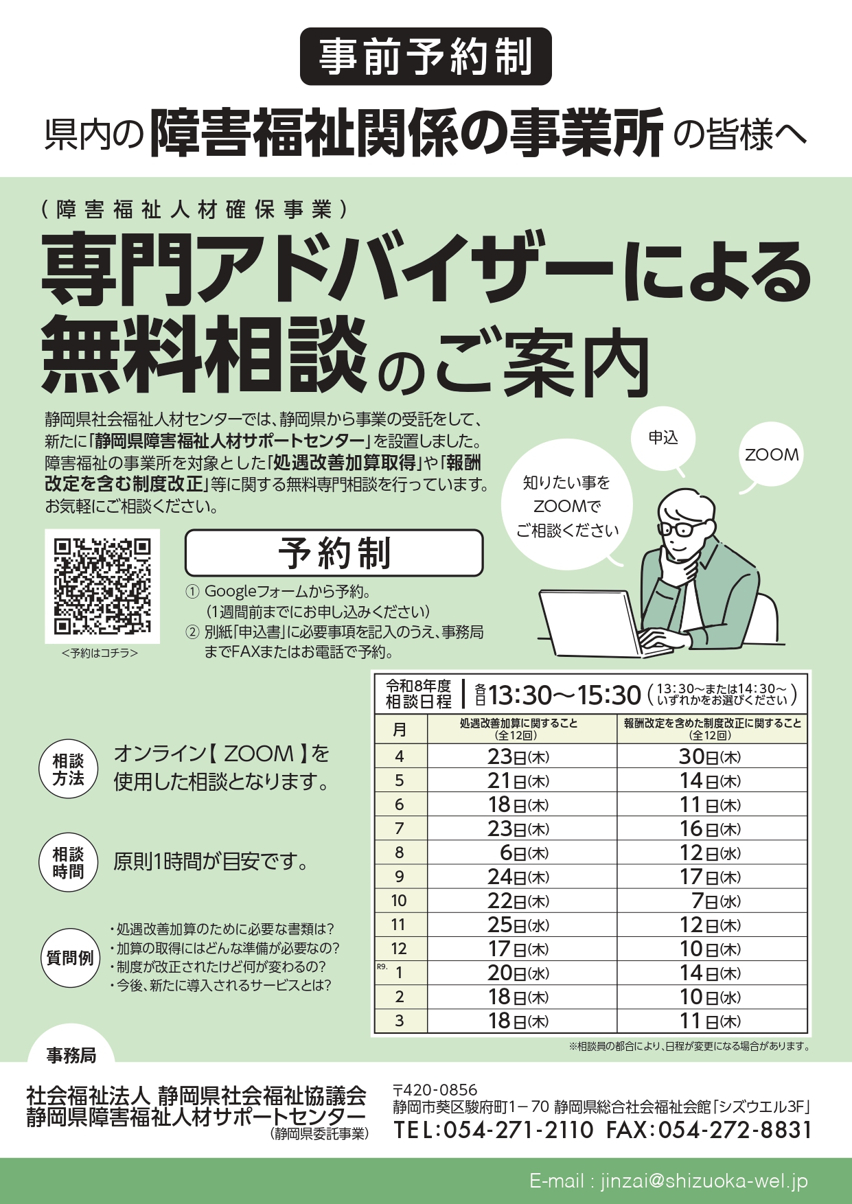 障害福祉サービス事業所等を対象とした「処遇改善加算取得」や「報酬改定を含む制度改正」等に関する無料専門相談を行っていますので、お気軽に御相談ください。