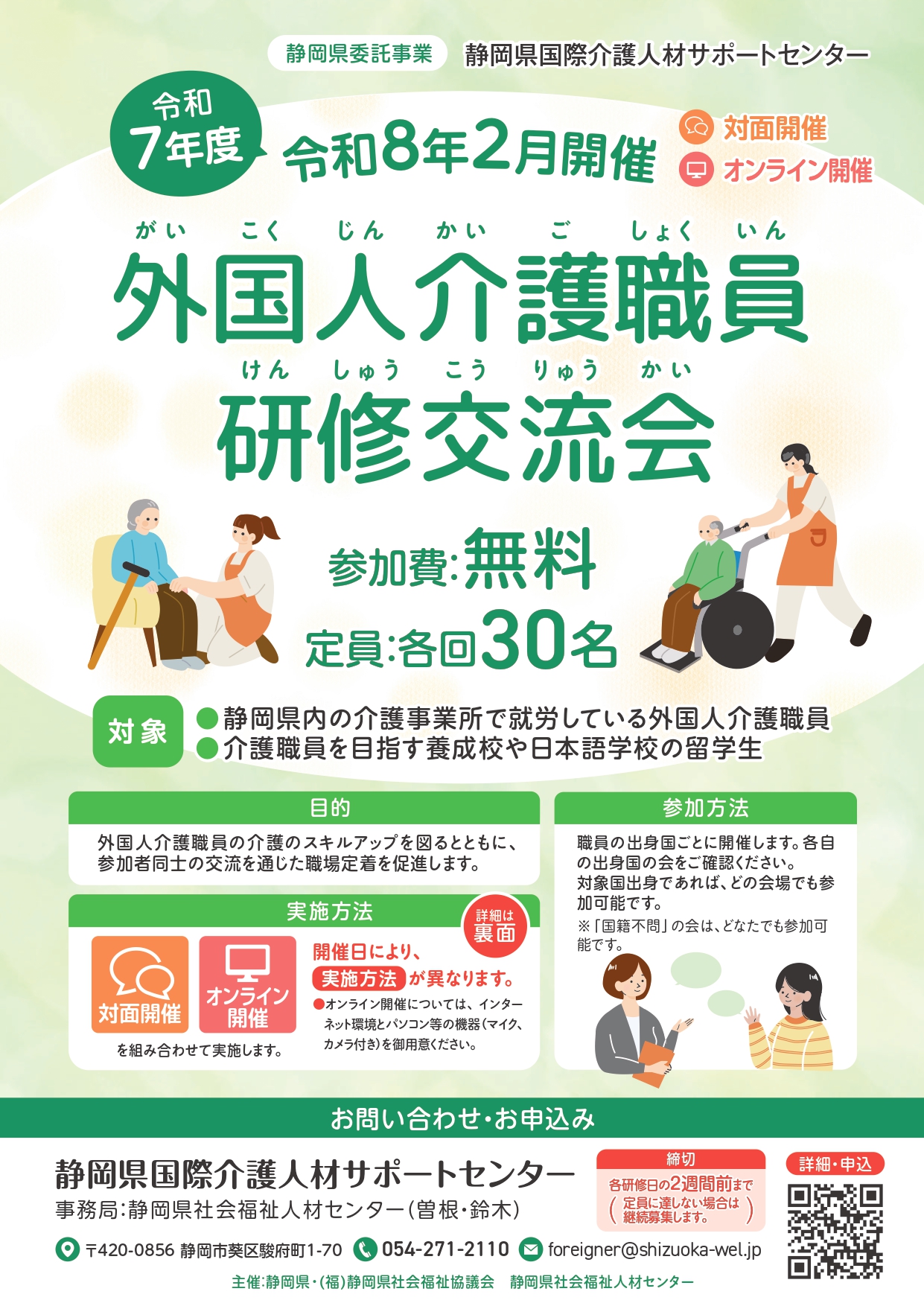 静岡県社会福祉人材センターでは、静岡県介護保険課から「静岡県国際介護人材サポートセンター」を受託し、その一環として「外国人介護職員 研修交流会」を開催しています。