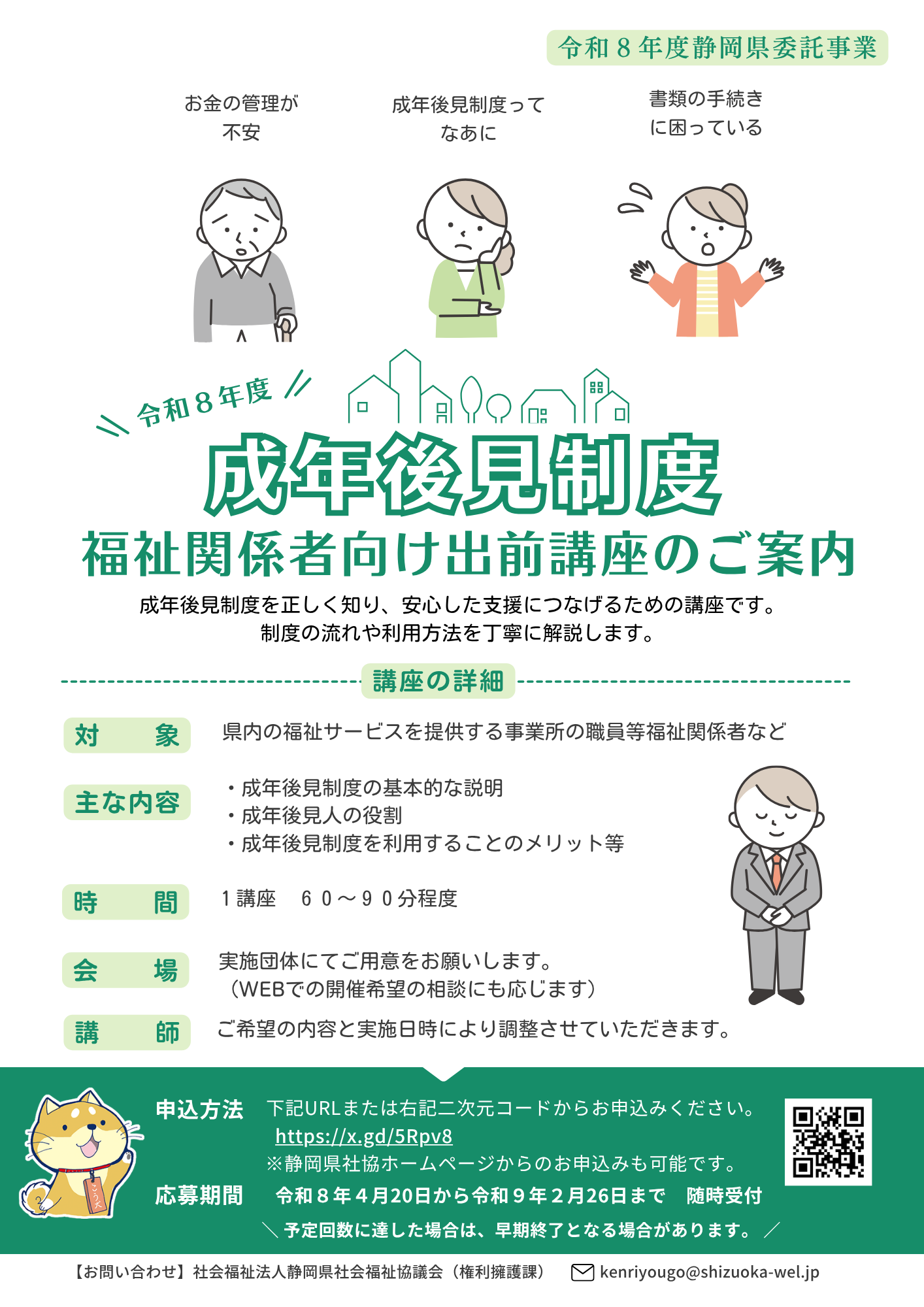 静岡県内の福祉関係者を対象に、成年後見制度についてわかりやすく学べる出前講座を実施します。