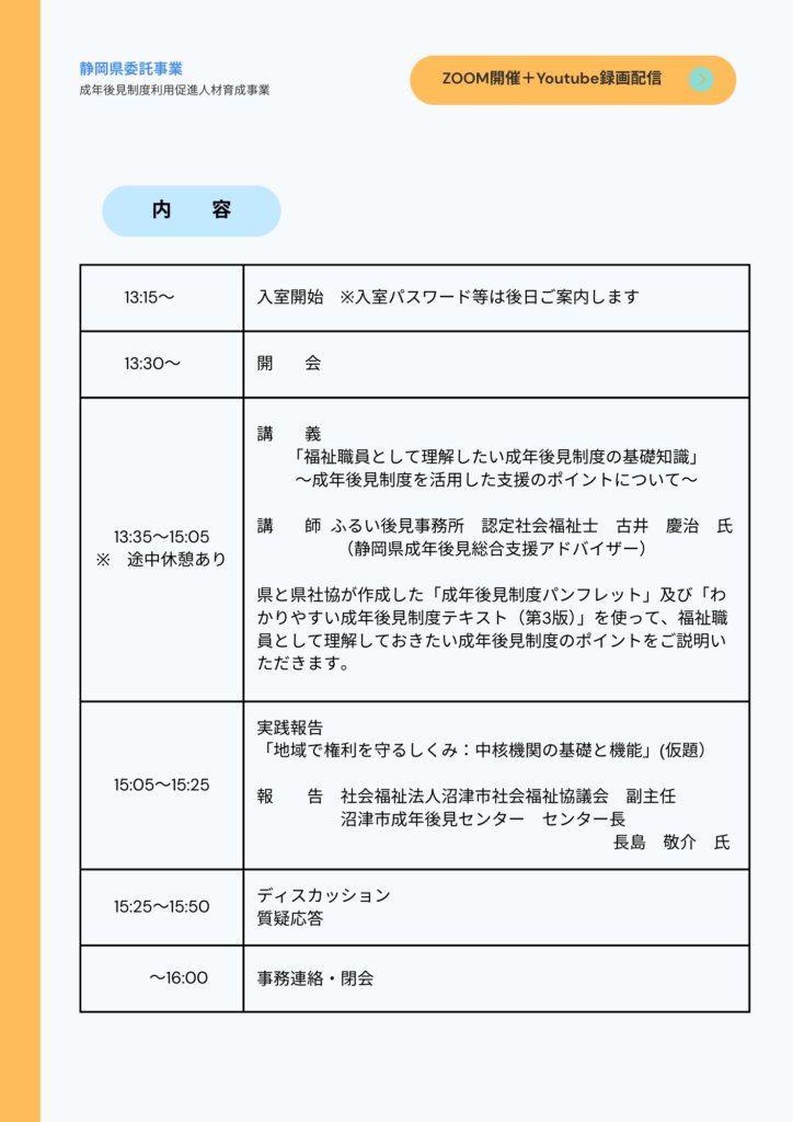 ~誰もが「住み慣れた地域」で成年後見制度を利用できる社会を目指し、ご本人の身近な支援者である福祉関係者が、制度内容や活用方法を学ぶオンライン研修会を開催します。~