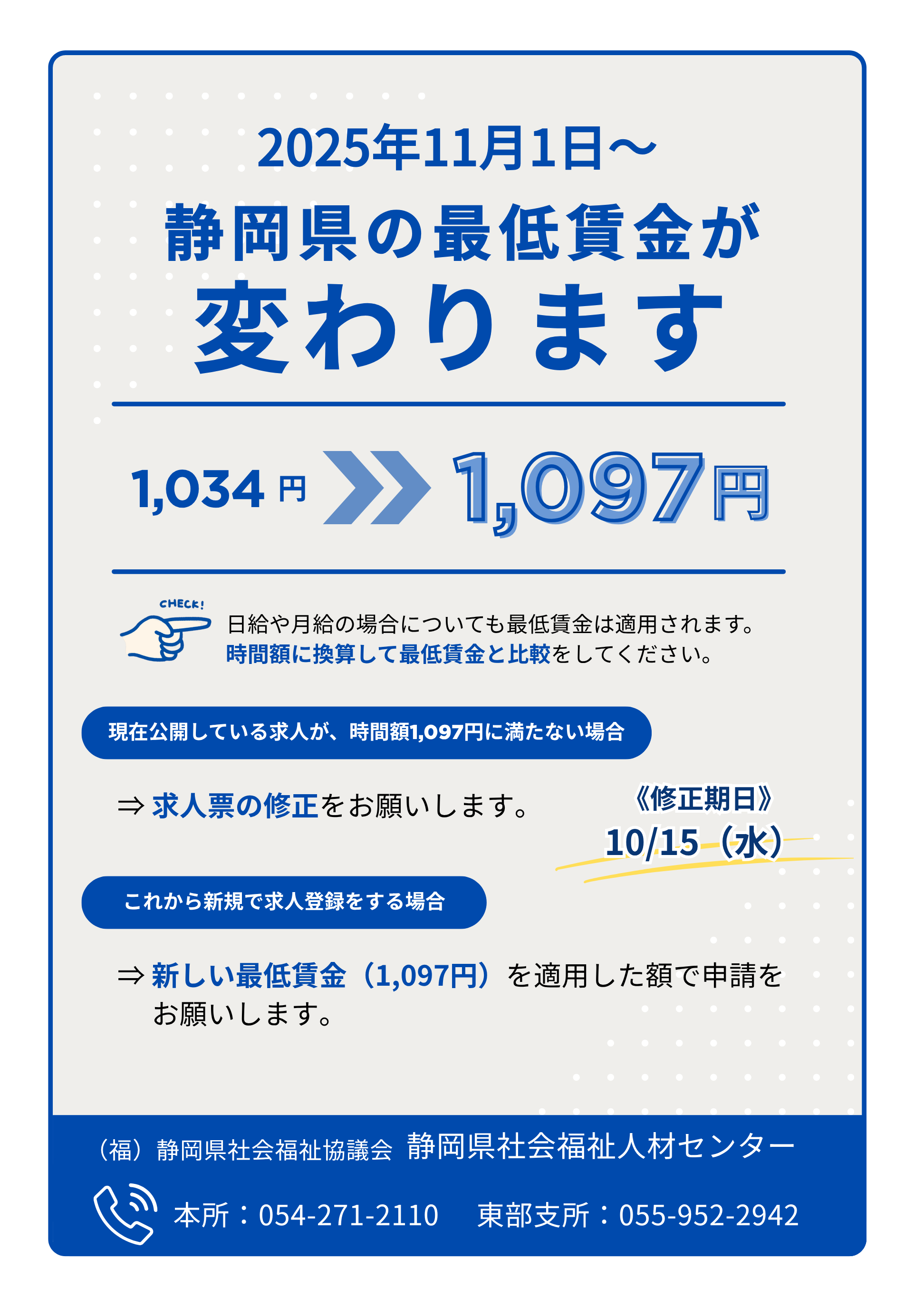 「静岡県最低賃金」が時間額1,097円に改正されます。